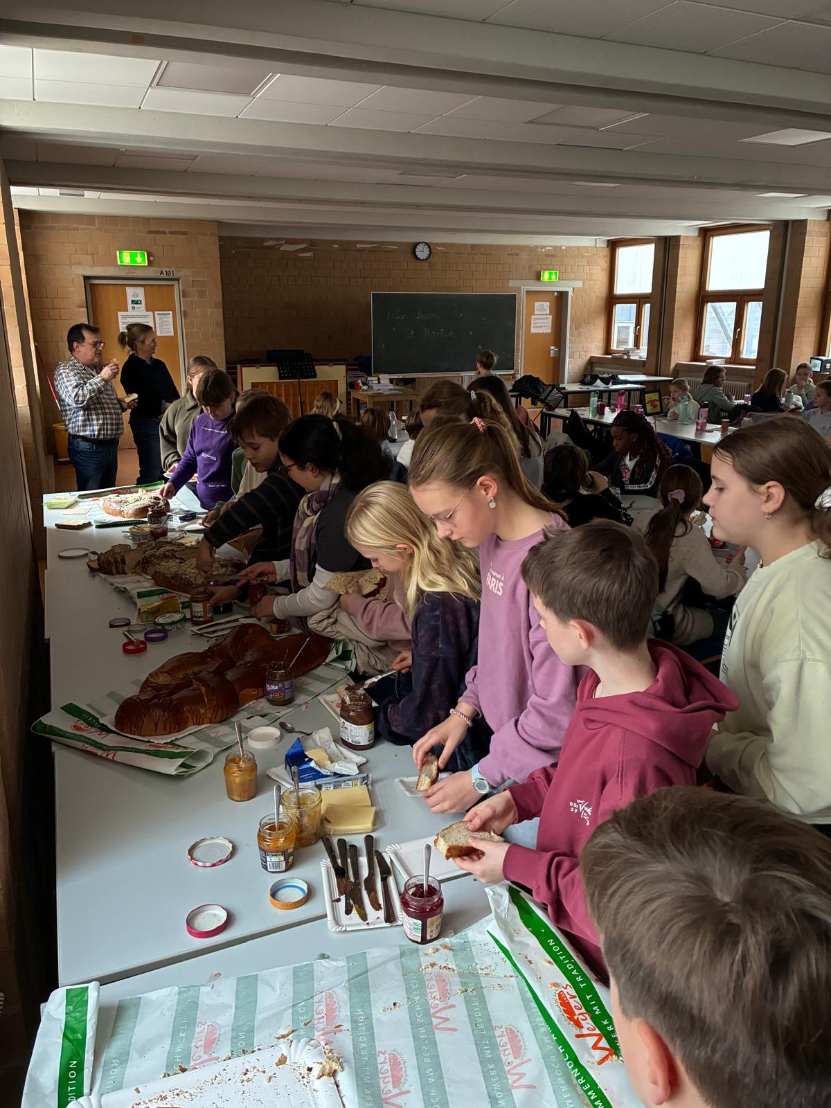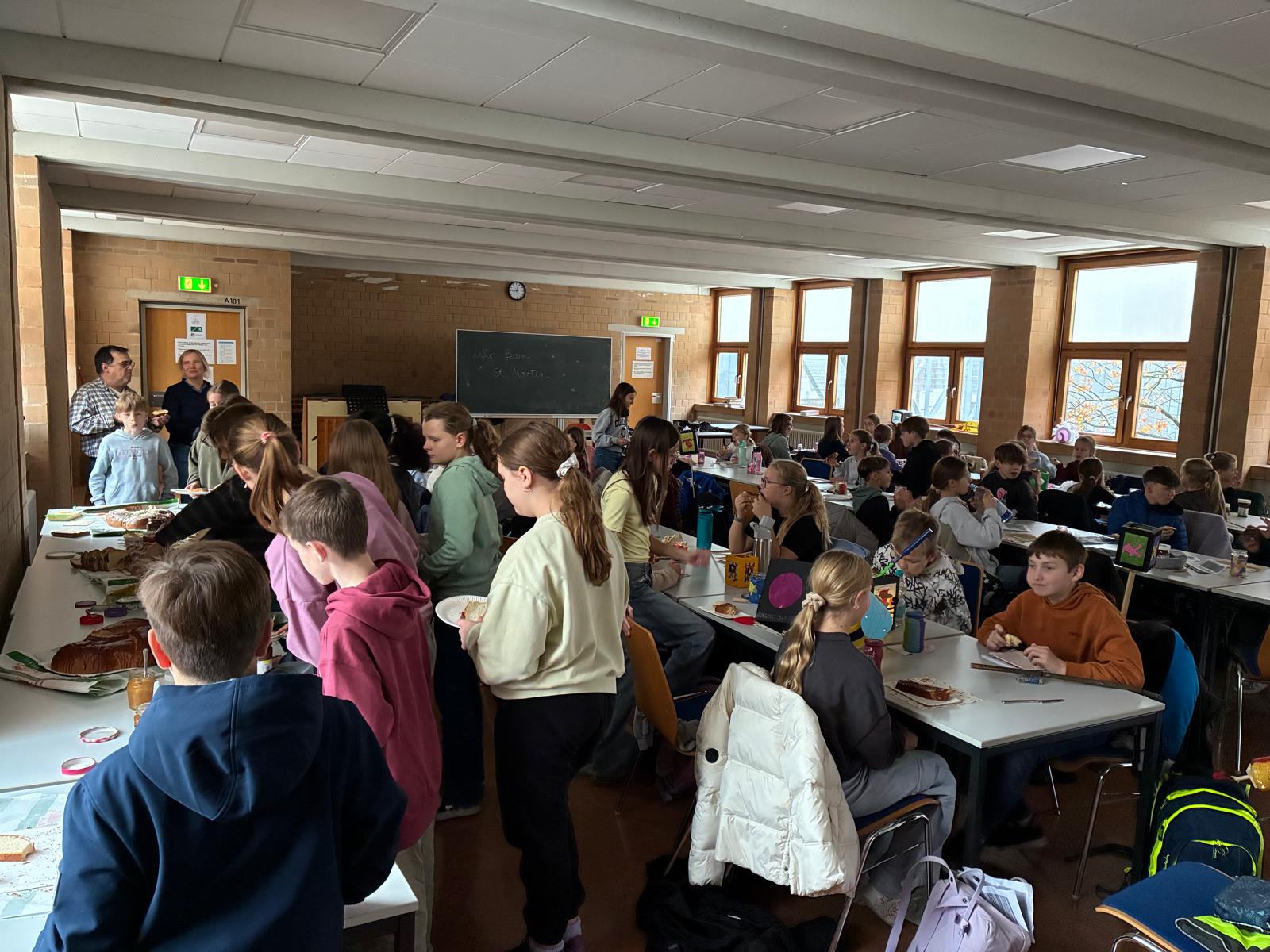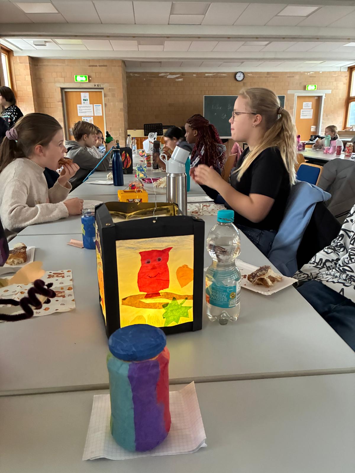 Nach dem Umzug ging es in den Klausurraum, wo bereits alles für ein gemeinsames Frühstück vorbereitet war. Höhepunkt waren die großen Weckmänner, die die Kinder gemeinschaftlich teilten. Die selbstgestalteten Tischlaternen, die auf den Tischen standen und warmes Licht verbreiteten, machten den Moment besonders gemütlich.