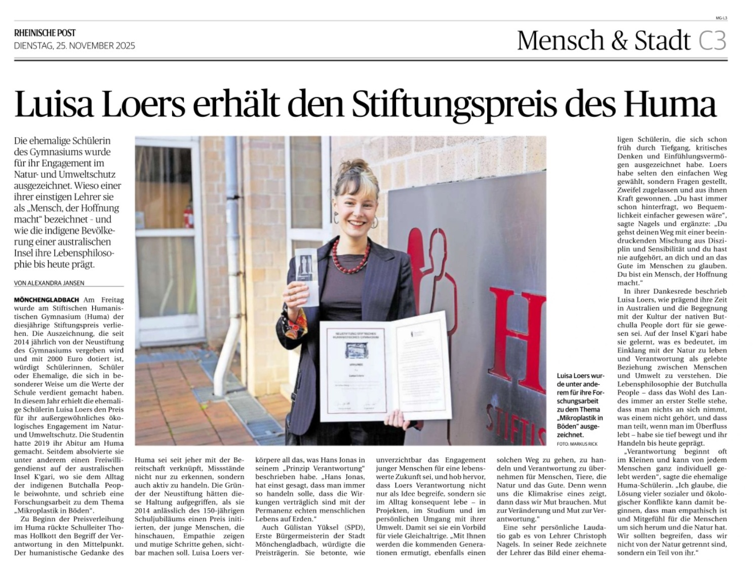 Die Neustiftung des HUMA verlieh den diesjährigen Stiftungspreis an Luisa Loers. Wir gratulieren der würdigen Preisträgerin sehr herzlich!