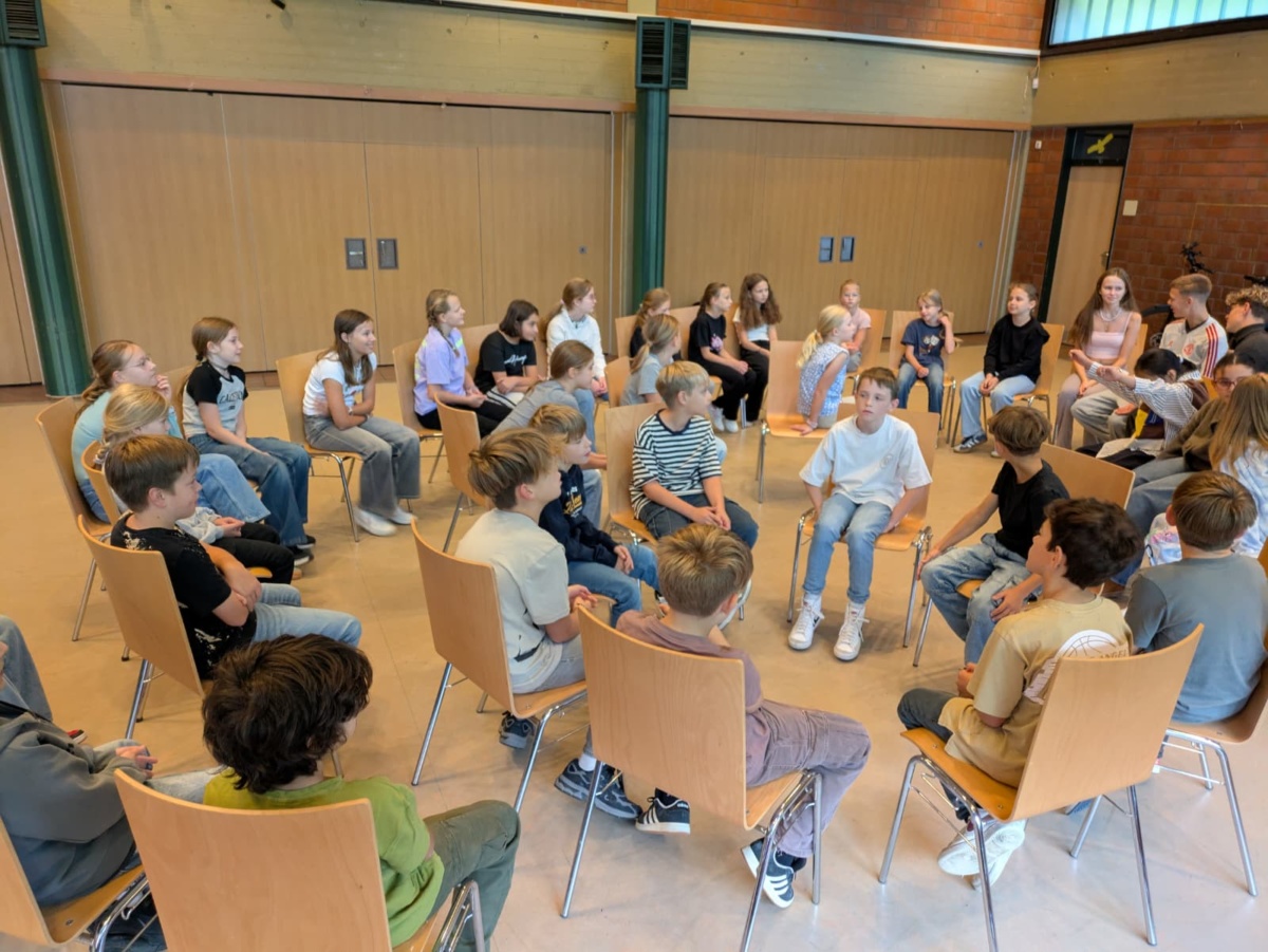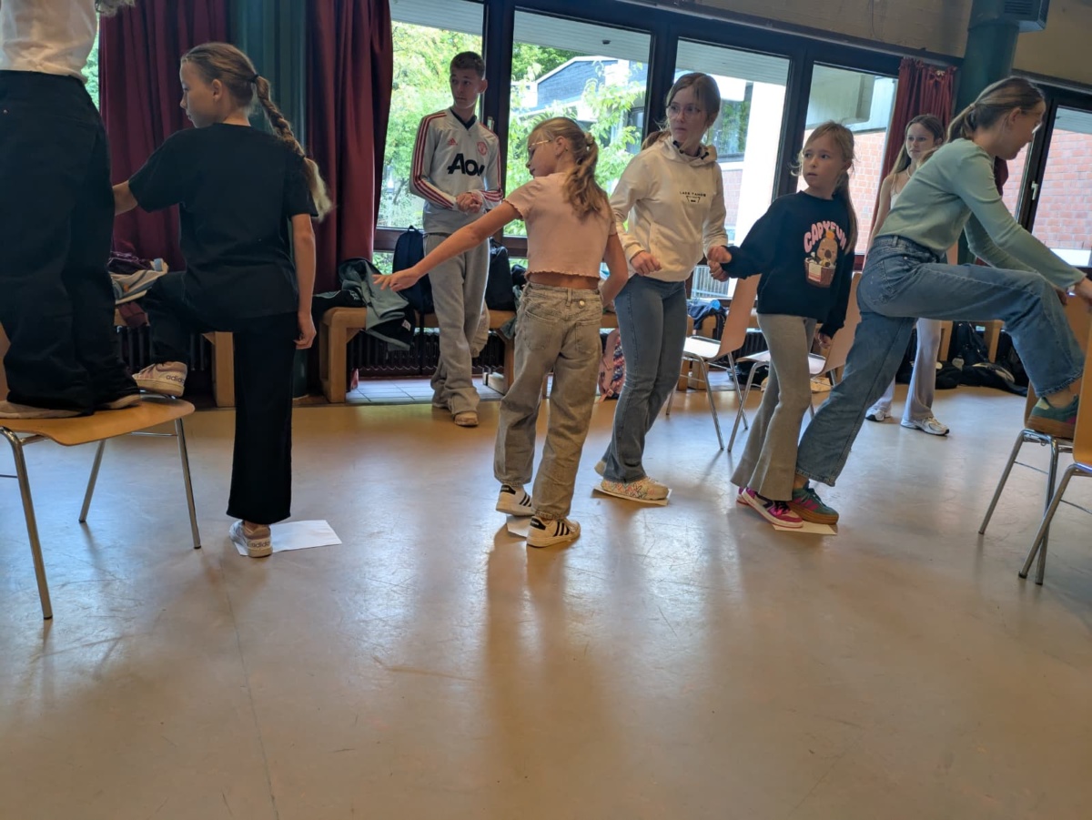 Am Dienstag, den 16.09.25, verbrachten wir im Westend unseren Teamtag. Es ging los mit dem Spiel „Die langsame Ameise“. Dabei sitzen alle bis auf ein Kind, das die Ameise spielt, auf Stühlen, die im Raum verteilt sind, und ein Stuhl bleibt frei. Die Kinder müssen verhindern, dass die Ameise sich hinsetzt, indem sie sich umsetzen. Die Ameise darf nur sehr langsam gehen. Es geht darum, als Team zusammenzuarbeiten.