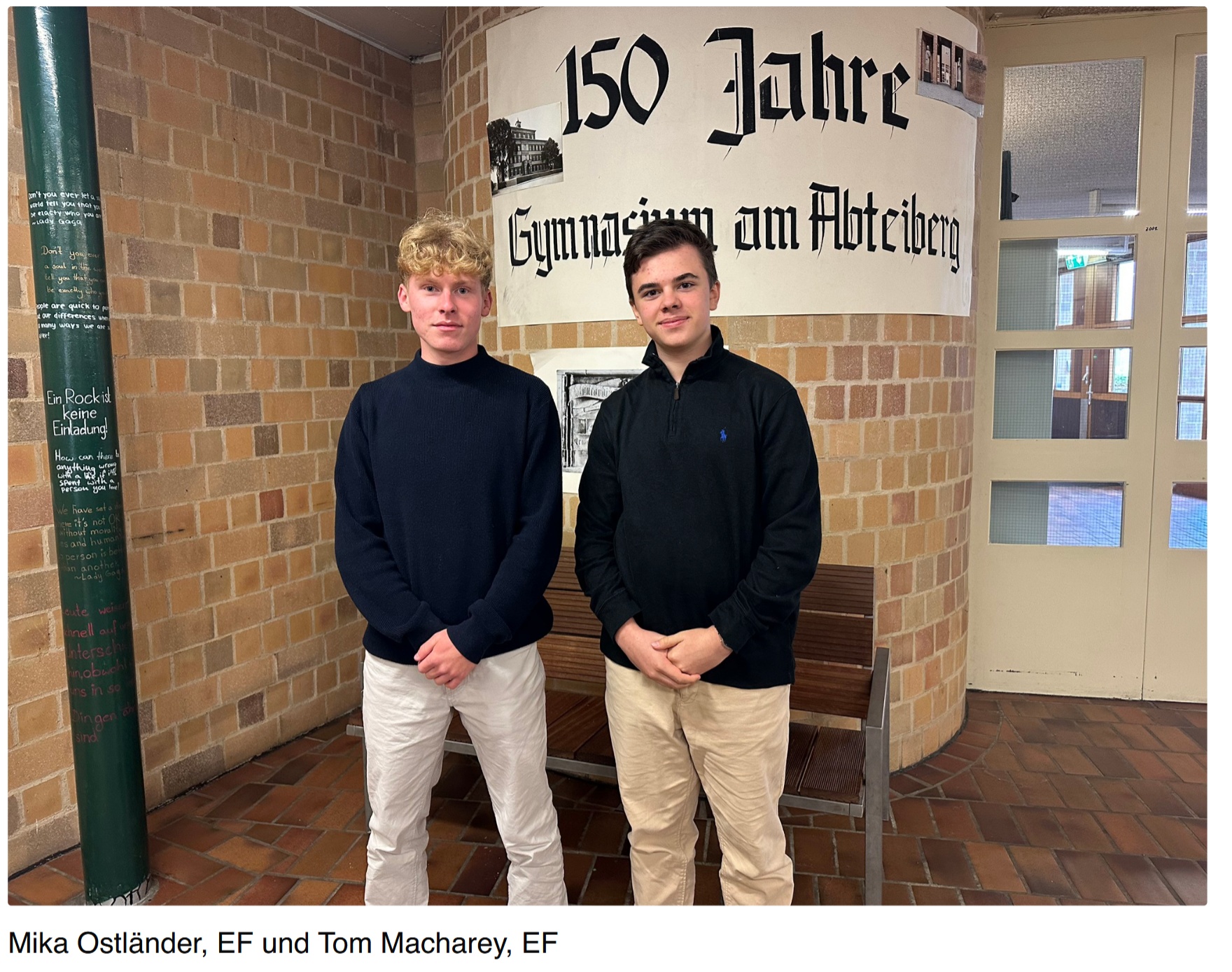 Das Angebot „Schüler helfen Schülern“ richtet sich an alle Schülerinnen und Schüler, die in einzelnen Fächern Unterstützung benötigen oder Lerninhalte vertiefen möchten. Wer Interesse oder Fragen hat, kann sich gerne bei Mika Ostländer (links im Bild unten) melden. Für die Teilnahme am Programm bitten wir darum, folgende Informationen mitzuteilen: Name, Klasse, gewünschte Fächer, verfügbare Zeiten sowie eine Email Adresse zur weiteren Kontaktaufnahme. Die Schülerinnen und Schüler, die Nachhilfe suchen, können sich anschließend direkt bei denjenigen melden, die Nachhilfe anbieten.